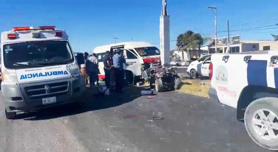 De acuerdo con información inicial, en el choque participaron una combi del servicio público de la ruta San Agustín Tlaxiaca- Pachuca, color blanco con rojo y una cuatrimoto.