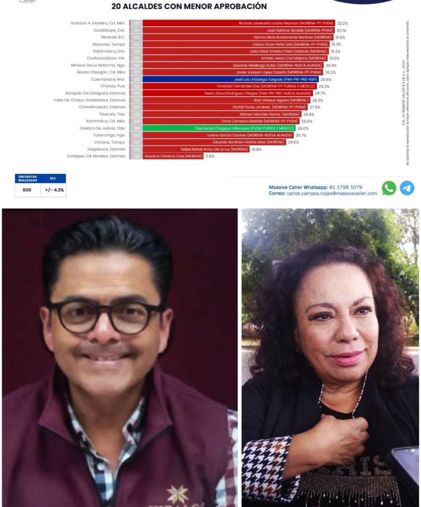 Jocelyn Andrade.- Los presidente municipales de Mineral de la Reforma y Tulancingo de Bravo, Eduardo Medécigo Rubio y Lorena García Cázares, se mantienen en los últimos lugares del ranking de aprobación de gobernantes locales, según la medición de octubre de la empresa consultora Massive Caller.