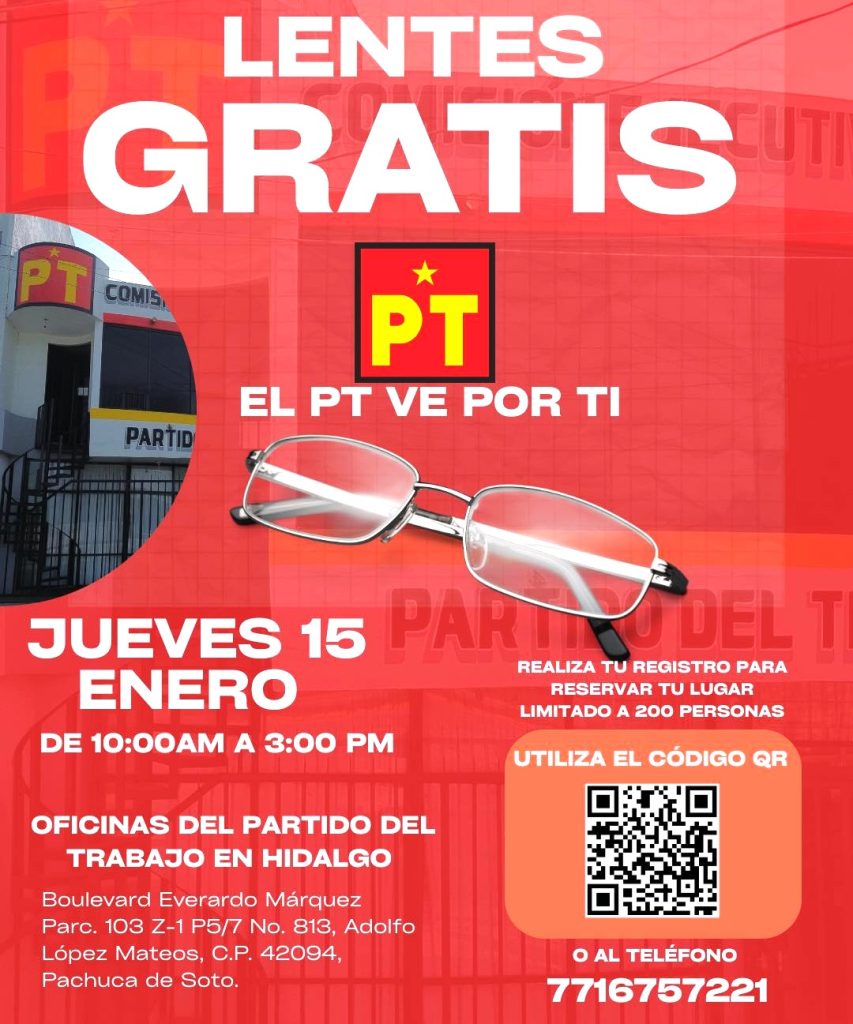 Jesús Castillo.- El Partido del Trabajo (PT) llevará a cabo una jornada de entrega gratuita de lentes, dirigida a la población que lo requiera, con el fin de otorgar los lentes adecuados a cada beneficiaria y beneficiario