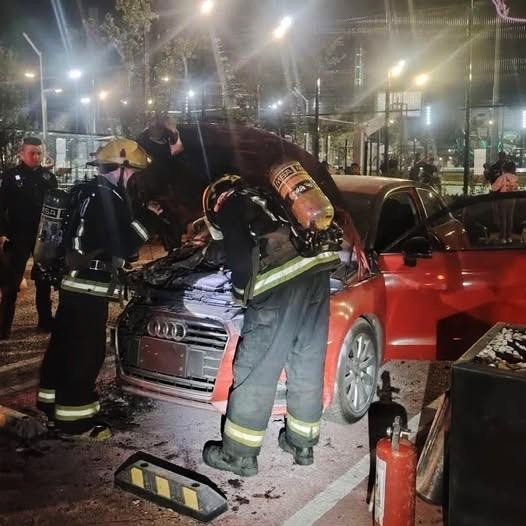 Elementos de rescate atendieron el reporte de un incendio de vehículo que se suscitó en el estacionamiento del Parque Cultural Hidalguense, donde se incendió un vehículo Audi, color rojo, en la zona del motor.