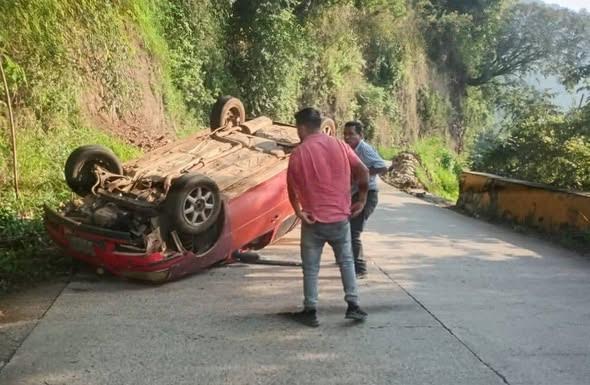 De acuerdo con información el chofer del vehículo compacto Volkswagen tipo Pointer, color rojo, perdió el control, por circular a exceso de velocidad, y terminó volcado con las llantas hacia arriba en una zona de curvas pronunciadas y pendientes.