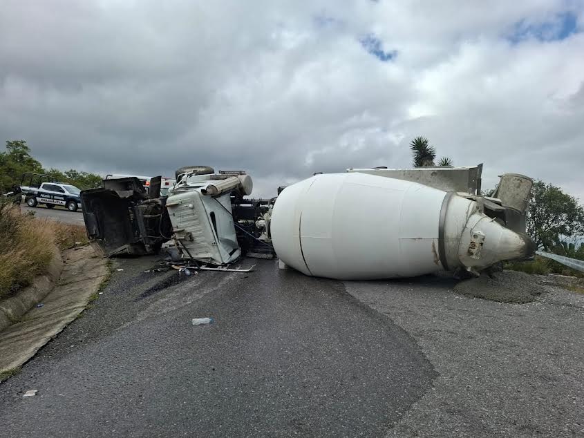 Juan Manuel Pérez. Alfajayucan.- Un camión tipo olla que transporta concreto protagonizó una volcadura sobre la carretera Alfajayucan – Chilcuautla, a la altura de Cerro Azul, bloqueando por completo la circulación vehicular en ambos sentidos.