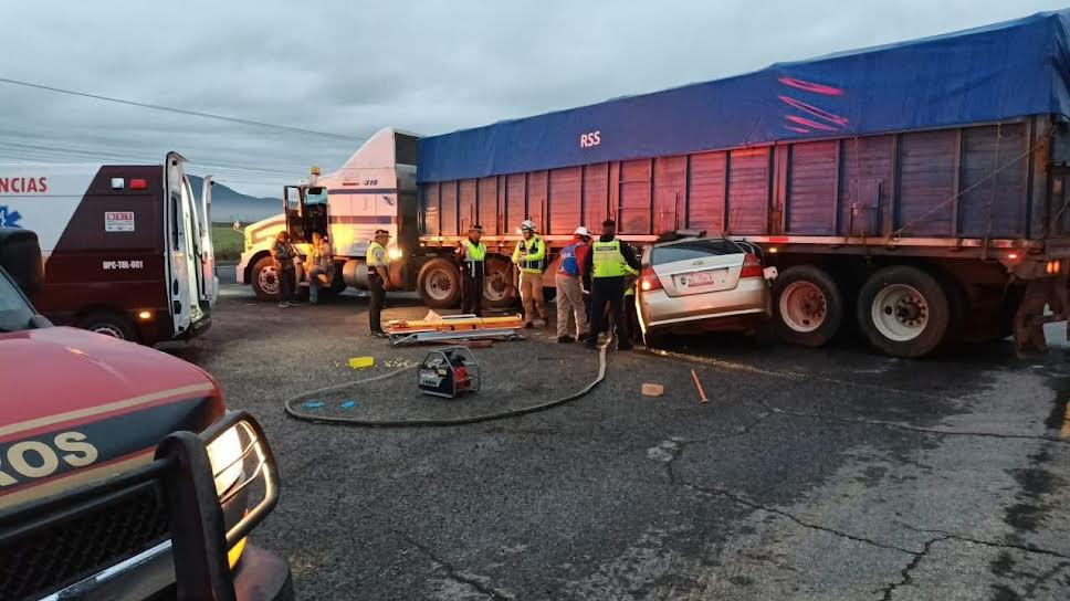En este accidente se vieron involucrados un Chevrolet Aveo, color café y un tractocamión Kenworth color blanco, que intentó dar vuelta, pero la unidad compacta se incrusto en medio de la caja color rojo.