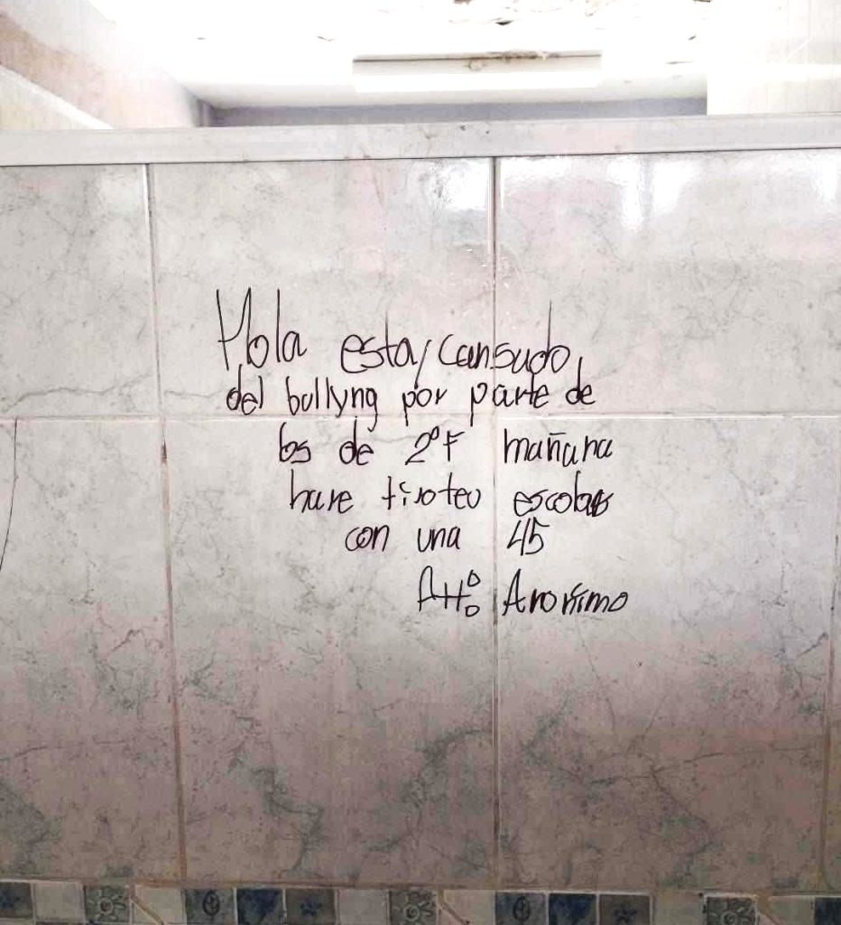 Uno de los escritos apareció en la secundaria técnica 10 de la comunidad Cerritos, en San Salvador; otro caso corresponde a la Escuela Secundaria General “Héroe Antonio Reyes”, en Huejutla, donde personal activó protocolos de seguridad, solicitó apoyo institucional y permitió recorridos de vigilancia dentro del plantel.
