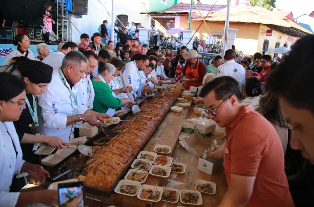 Entre los momentos más esperados del festival estuvo la presentación del paste gigante de papa, de 4 metros de largo y 200 kilogramos de peso, elaborado por los 19 miembros del Consejo Regulador del Patrimonio Cultural del Paste (COREPAC) junto con una comitiva inglesa especializada en la técnica tradicional.