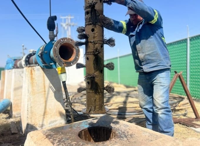 Posteriormente se ejecutaron labores de limpieza mecánica y el procedimiento incluyó cepillado y pistoneo en las paredes del pozo y en componentes del sistema; estas acciones retiraron incrustaciones y sedimento acumulado que provocaban obstrucciones en el flujo de agua, expuso.