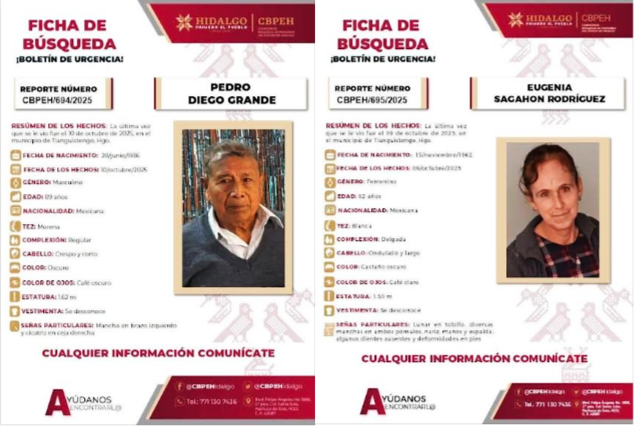 Pedro Diego Grande, de 89 años, visto por última vez el 10 de octubre de 2025 en el municipio de Tianguistengo. Características: género masculino, tez morena, complexión regular, cabello crespo y corto, color oscuro. Ojos café oscuro. Estatura de 1.62 metros. Señas particulares: mancha en brazo izquierdo y cicatriz en ceja derecha.