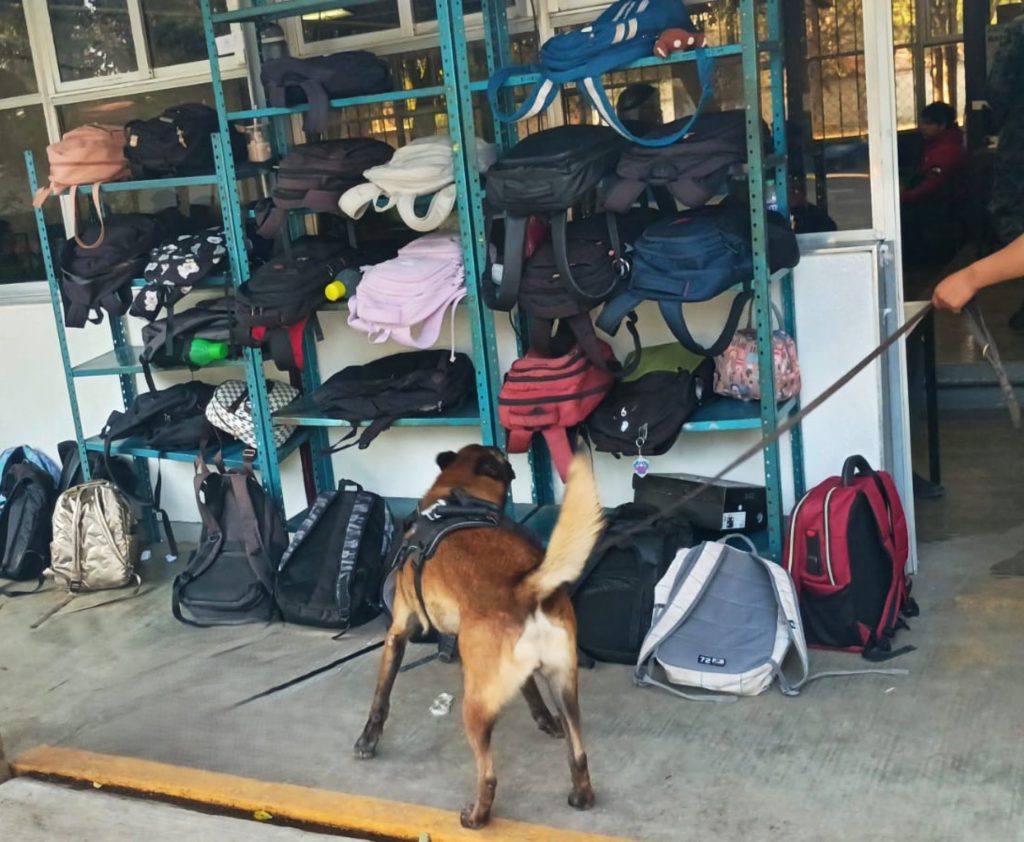 Apoyados con binomios caninos, los efectivos de la Guardia Nacional inspeccionaron cada una de las aulas y talleres del plantel, en acciones que incluyeron la revisión de mochilas del alumnado, con aval de paterfamilias, tutores y personal directivo, considerando la posibilidad de riesgo para toda la comunidad