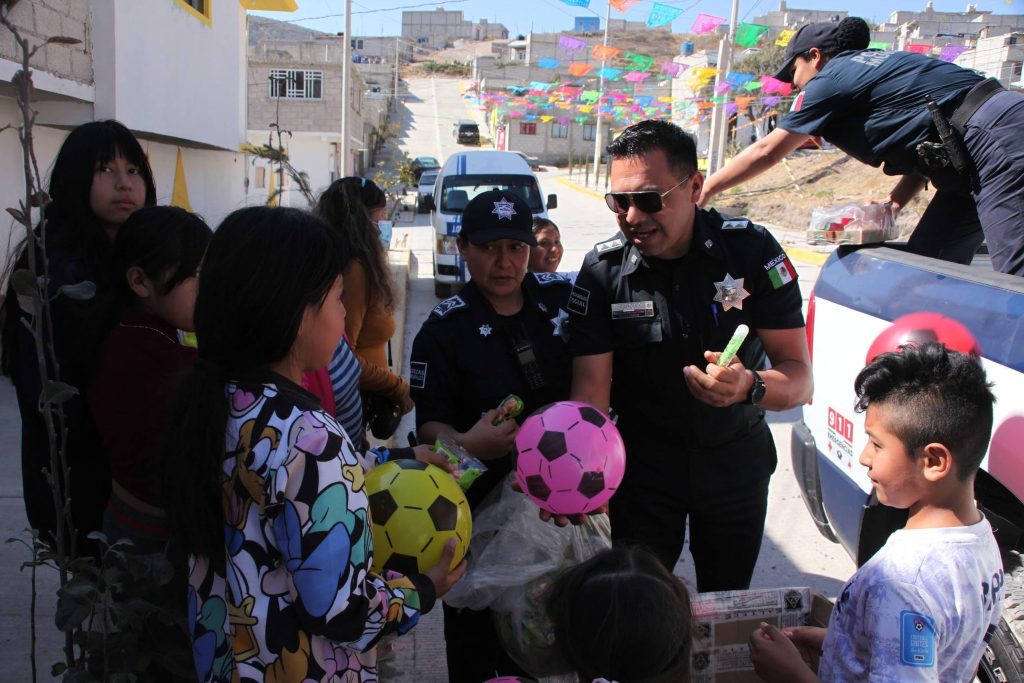 Jesús Castillo.- Como parte de las actividades del Día de Reyes, elementos de la Policía Municipal de la capital de Hidalgo visitaron varias colonias para entregar dulces y dulces a las niñas y niños.