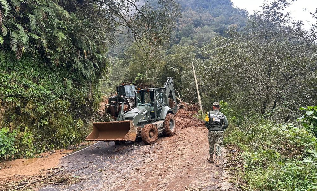 San Bartolo Tutotepec: Retiro de material por parte de elementos del Ejército Mexicano en la carretera estatal Metepec–Tenango–San Bartolo, hasta el kilómetro 27+000, con apoyo de dos cargadores frontales y tres retroexcavadoras.