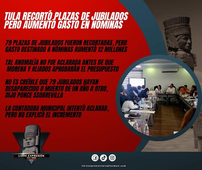 Miguel Á. Martínez. Tula de Allende.- El ayuntamiento aprobó el Presupuesto de Egresos 2026 con una contradicción: menos trabajadores, pero más dinero para sueldos. Mientras el documento elimina 79 plazas de personal jubilado, la administración se autorizó 12 millones de pesos adicionales para pagar nómina de funcionarios.