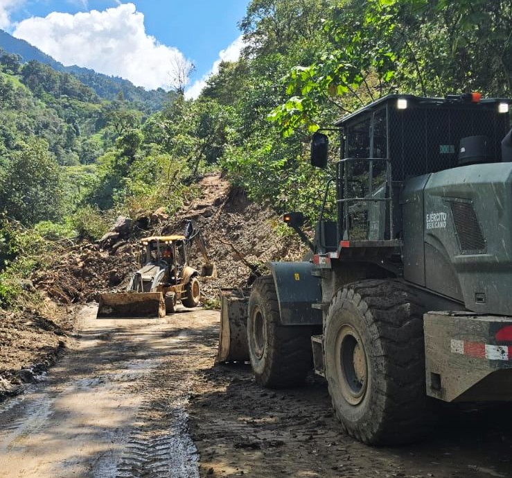 Asimismo, la Secretaría de Infraestructura, Comunicaciones y Transportes (SICT) se sumó al esfuerzo con rastreo, desazolve de cunetas y retiro de caídos en el camino rural El Ixtle – El Aguacate, apoyándose en una motoconformadora.