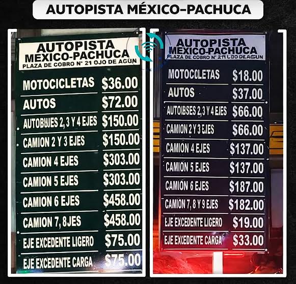 En la autopista México-Pachuca, el costo de la caseta para automóvil pasó de 69 a 72 pesos en la caseta de Ojo de Agua; mientras que para autobús de dos ejes ahora es de 150 y para motocicleta, 36 pesos.