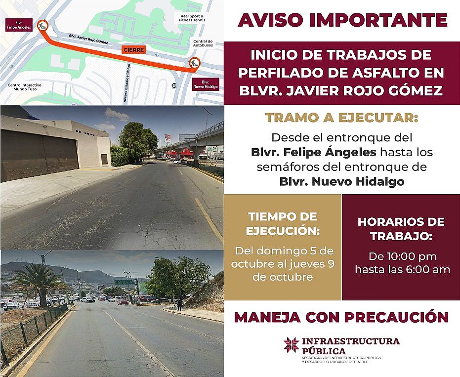 La dependencia estatal indicó que esta obra forma parte del programa de mantenimiento de vialidades principales en la capital hidalguense, pues con la intervención en el bulevar Javier Rojo Gómez se busca garantizar un mejor desplazamiento y fortalecer la seguridad vial en una de las rutas más utilizadas de la ciudad.