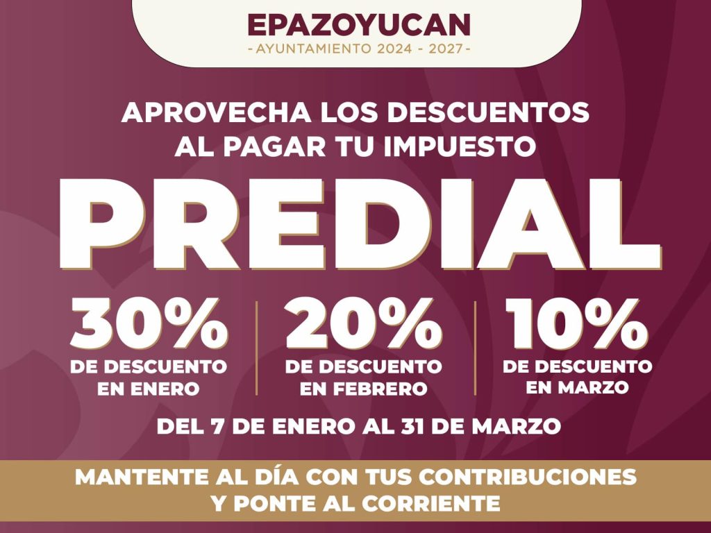 Jesús Castillo. Epazoyucan.-La administración municipal recordó a la ciudadanía que mañana finaliza el beneficio fiscal del 20 por ciento de descuento en el pago del impuesto predial correspondiente al ejercicio 2026.