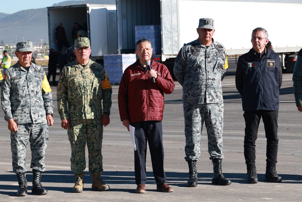 Ante los daños a vías terrestres se tendieron puentes aéreos con ocho helicópteros; también 11 lanchas, 68 máquinas en operación, 109 máquinas, con la ayuda de mil 165 elementos de la Defensa y Guardia Nacional; 240 de la Marina; 55 de la Secretaría de Salud y 6 mil 480 servidores públicos en territorio, que distribuyeron 10 mil despensas y 30 mil 168 medicamentos.